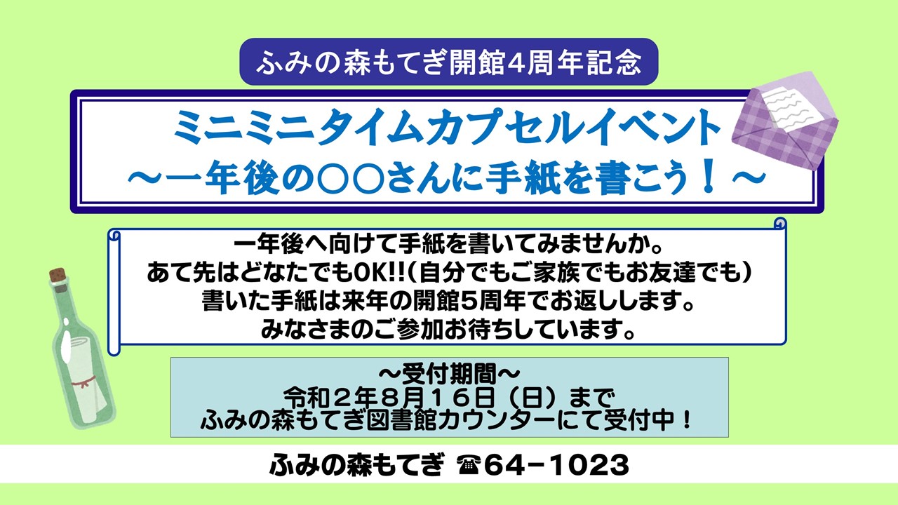 ふみの森もてぎが、「一年後の○○さんに手紙を書こう!」という企画を実施している。一年後の自分、両親、子供、友達など、誰かに宛てた手紙を書いて、ふみの森もてぎのカウンターで封筒をもらい封印し、住所・氏名を書いて受付印を押してもらってタイムカプセルに保管していただく。この手紙は一年後に本人に渡されることになる。